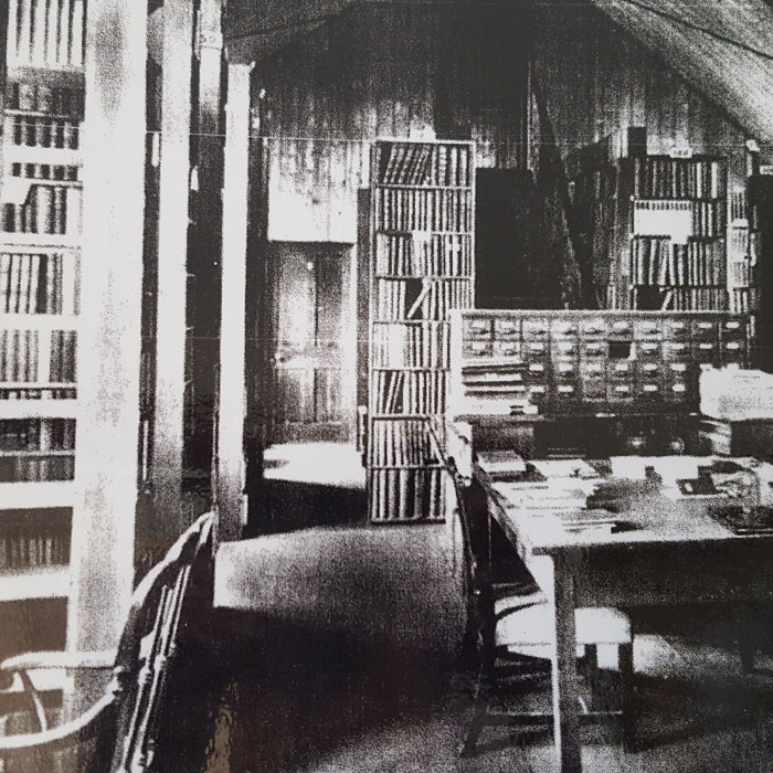 The Library was always envisioned as having a residential aspect, but at first the books were housed separately from residents. The ‘Tin Tabernacle’ stood at the back of the Reading Rooms – where the newer Annex stands now.